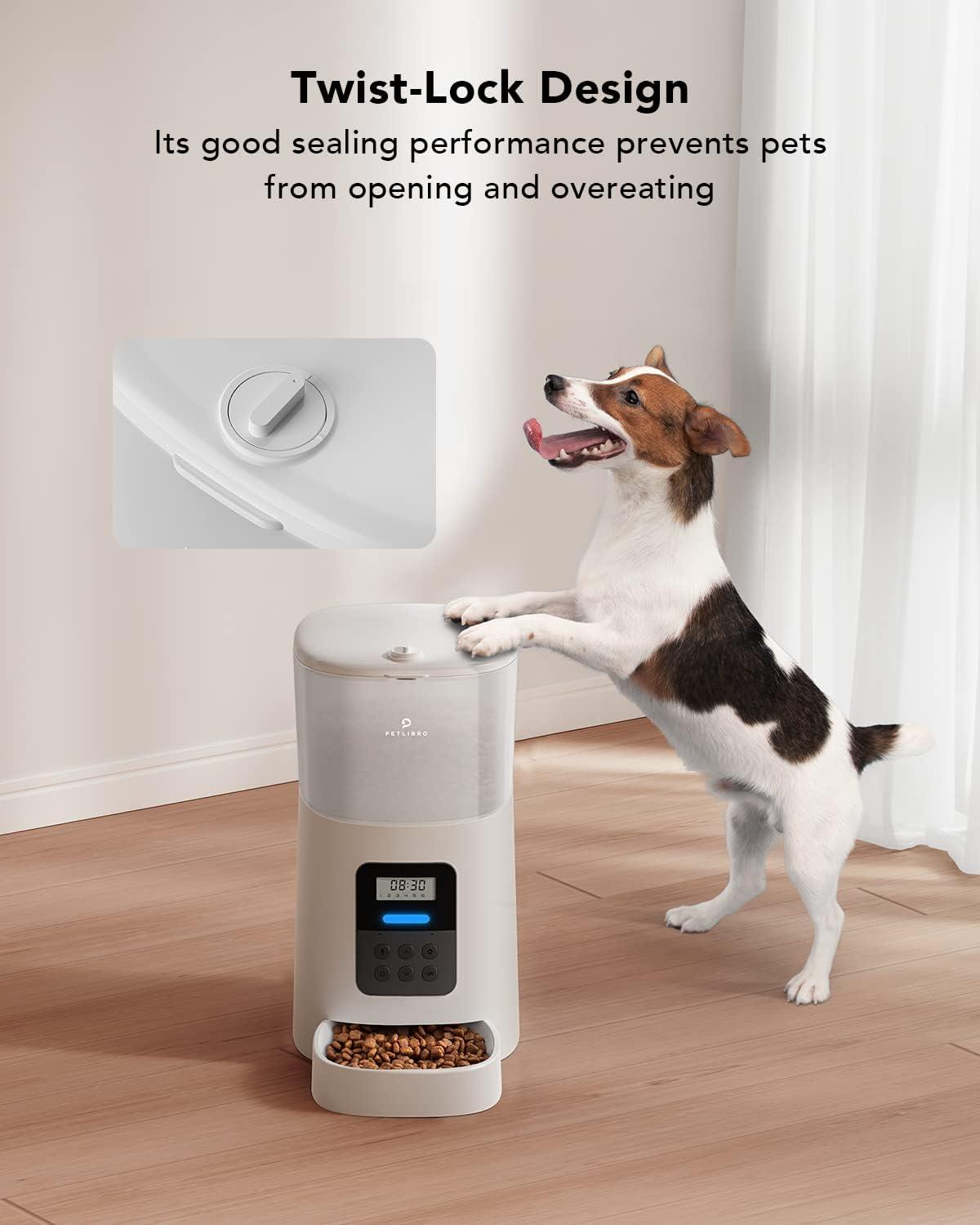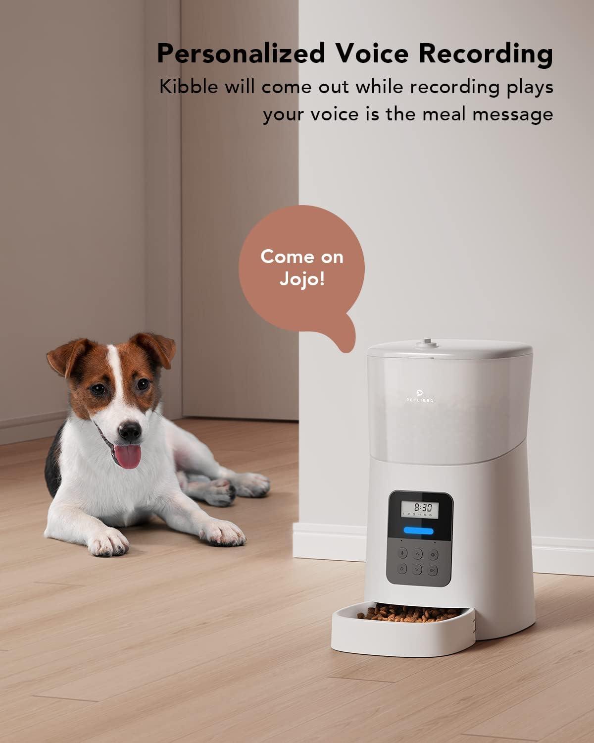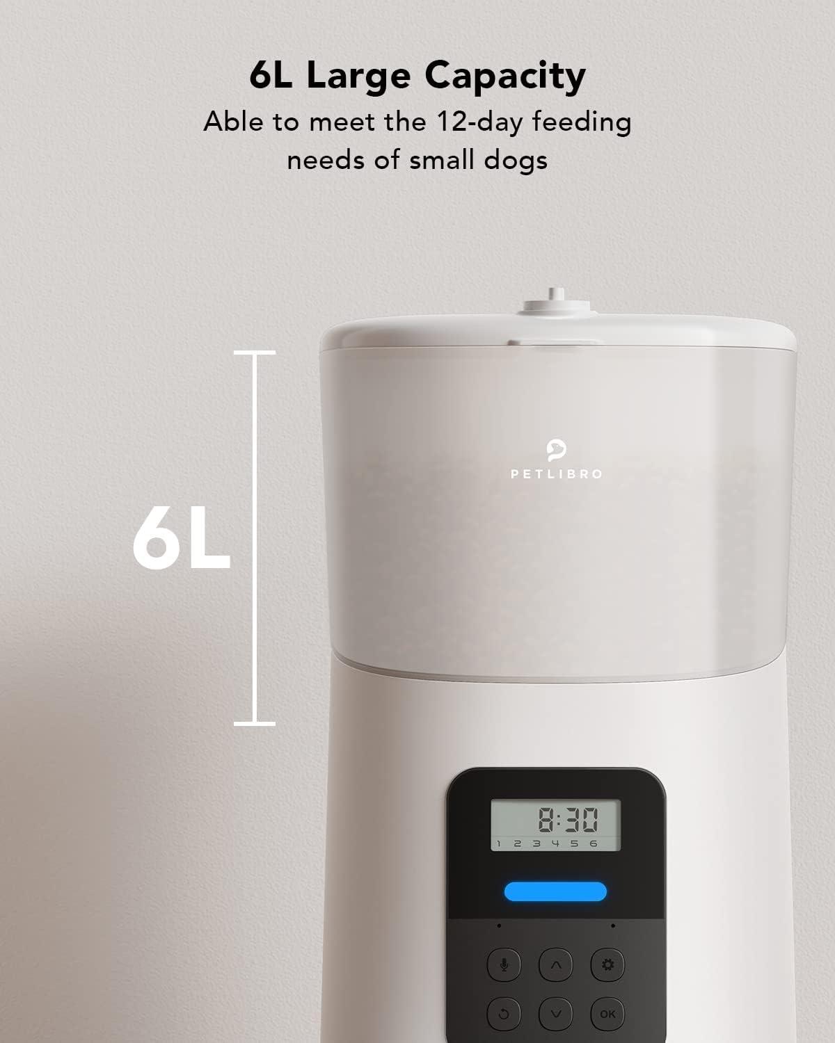 Right Portions at the Right Time: PETLIBRO automatic dog feeder up to 6 meals daily with 1-50 portions(15ml each), Large food tank with 6L capacity. Equipped with an anti-stuck function, no more pre-dawn wake-up calls, or worry when traveling