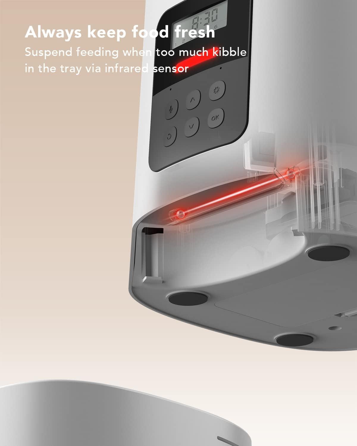 Easy-to-Read LCD Panel: Program the feeding on the LCD panel with detailed instructions; a Clear LED indication lets you know every status of the auto cat feeder, and the built-in infrared sensor can easily tell you the situation of insufficient food or stuck