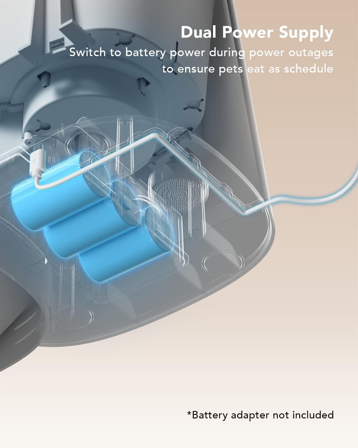 Your Pet Always Gets Food: Auto cat feeder powered by a 5V DC adapter normally, with 3 alkaline D-cell batteries (NOT included) installed as backup power supply. This clog-free auto cat food dispenser with a timer keeps your pet fed consistently