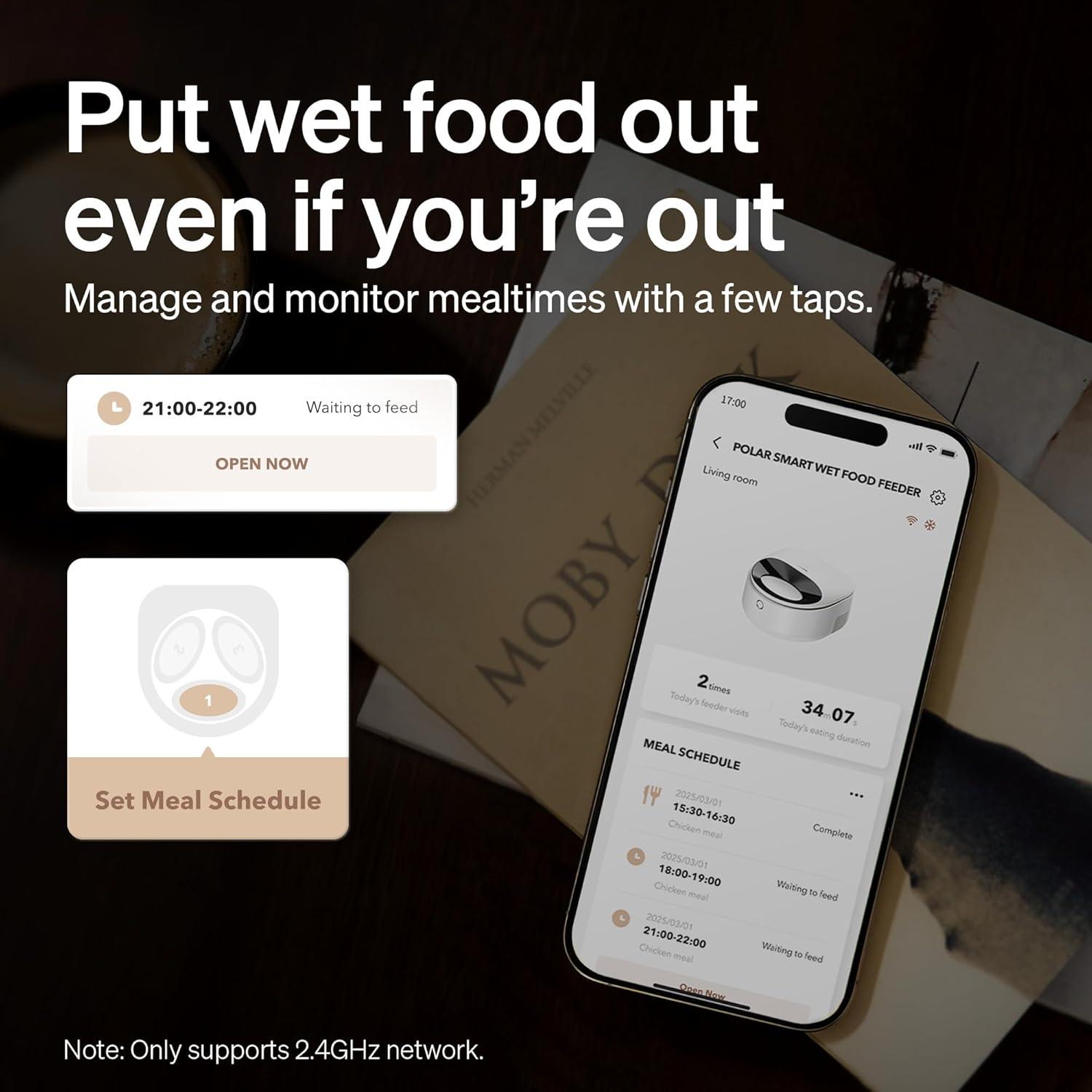 Remote App Connectivity: Stay connected to your pet’s diet with this smart automatic cat food dispenser for wet food. Through the dedicated app (2.4GHz Wi-Fi only), you can schedule meals, check feeding logs, and use the “Feed Now” function to instantly open the lid or expose unfinished food, ensuring no meal goes to waste.